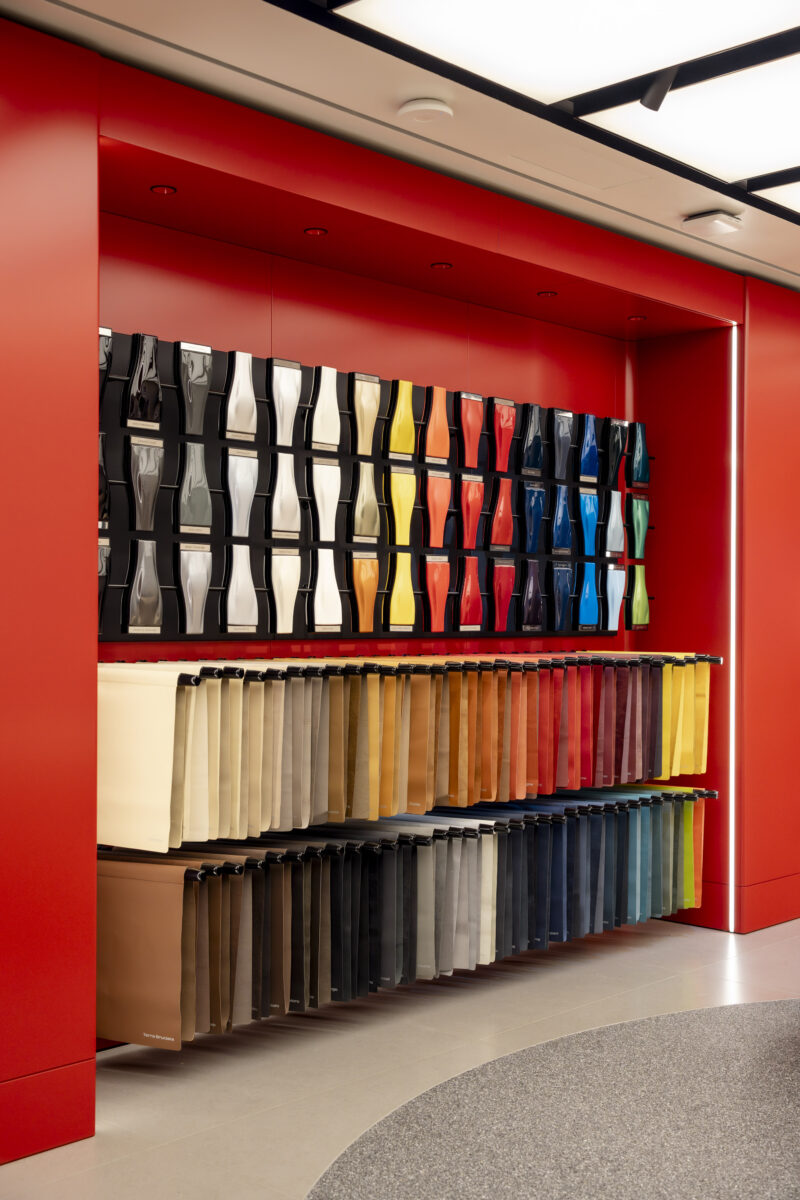ショールーム中央にある円形の空間は、イタリアの街や都市の活気あふれる広場を示す「ピアッツア」と名付けられ、フェラーリファミリーに属する人々がブランドの世界観に没入し、経験を分かち合える交流の中心地となる。