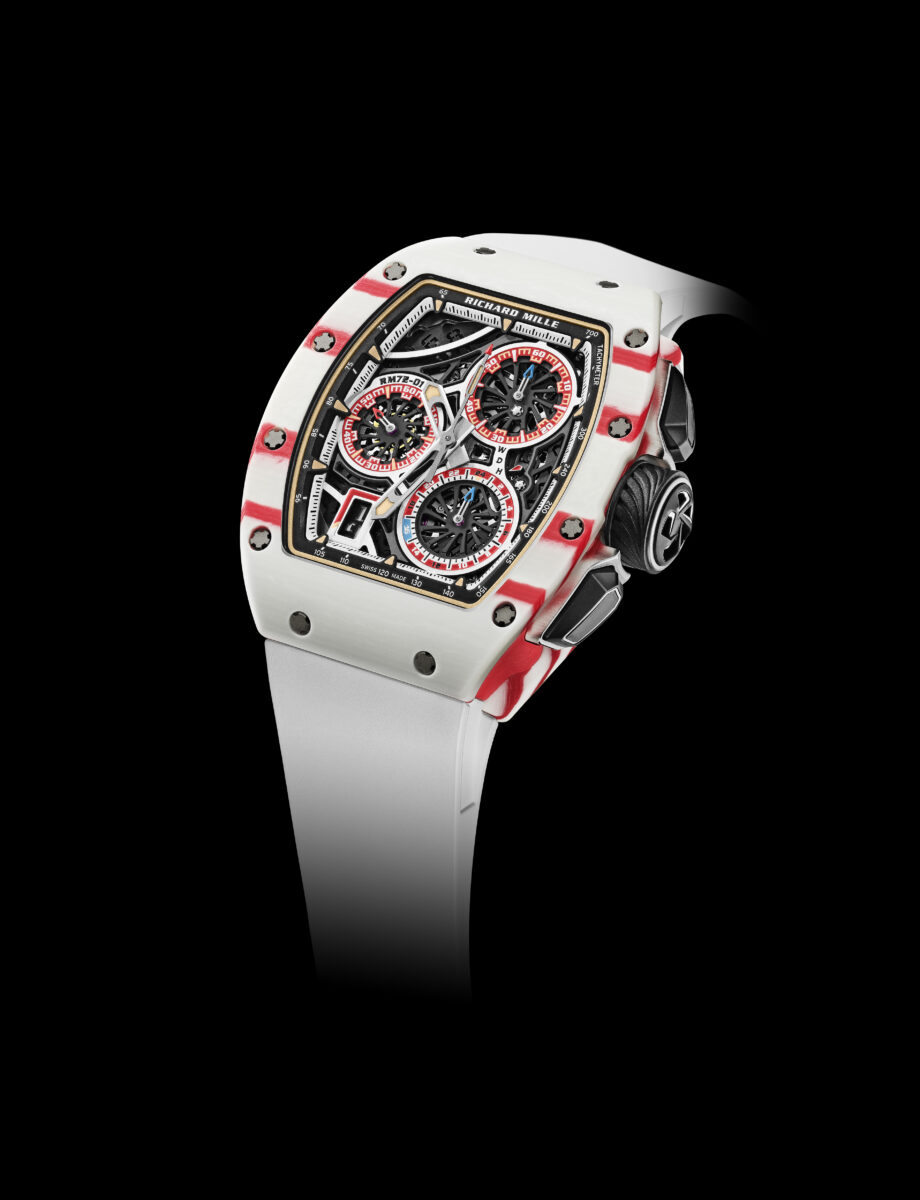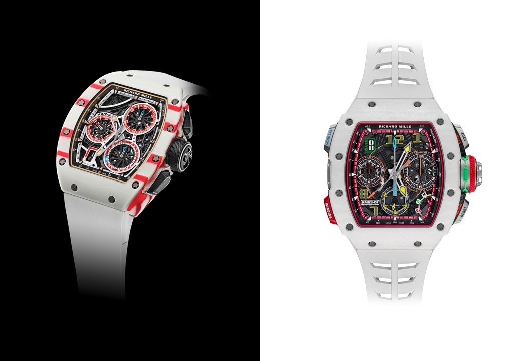 もうひとつは、名門スクーデリア・フェラーリからF1グランプリに参戦している現役レーシングドライバーのシャルル・ルクレール選手モデルのプロトタイプ「RM 72‐01オートマティック フライバック クロノグラフ」で、自動巻き(自社製キャリバーCRMC1)、縦47.34×横38.40×厚み11.68mm、ホワイト&レッドクオーツTPT®ケース&ベゼル、約50 時間パワーリザーブ参考価格 :285,000CHF(スイスフラン)。