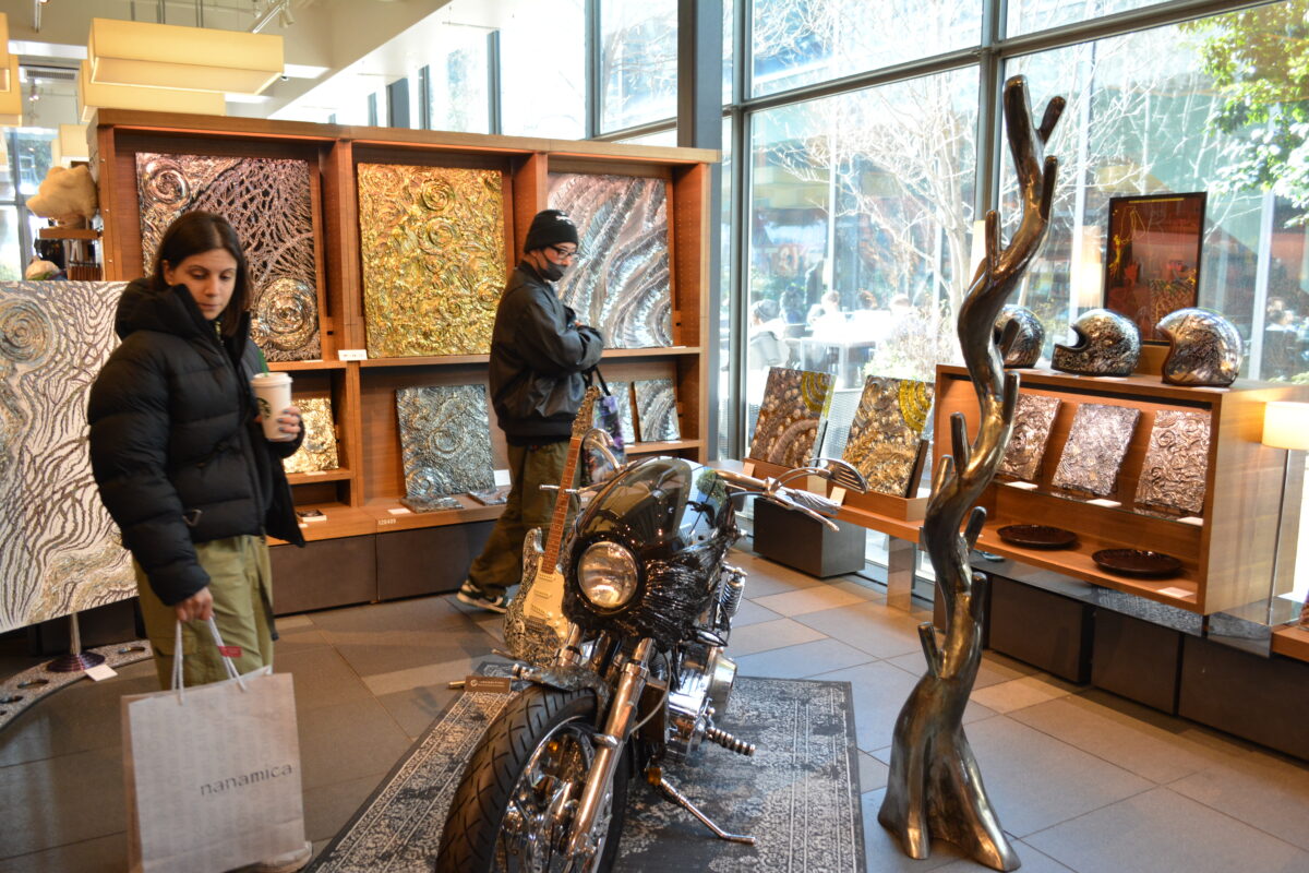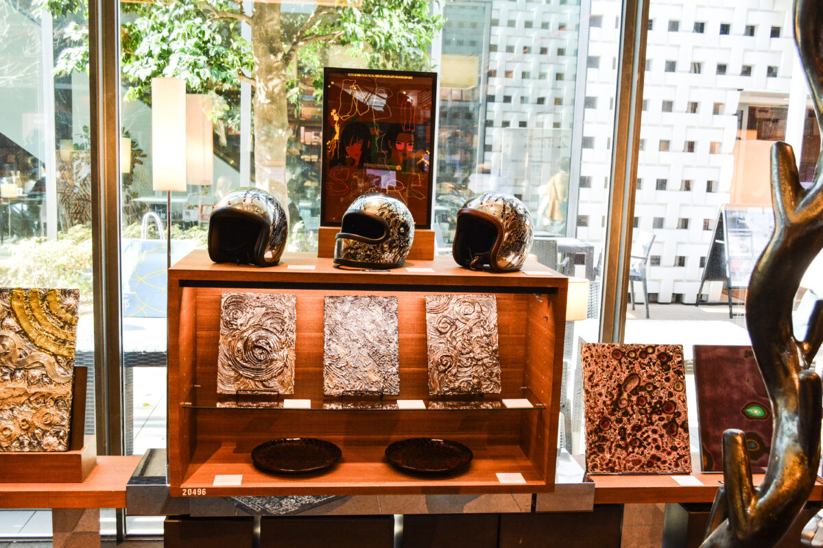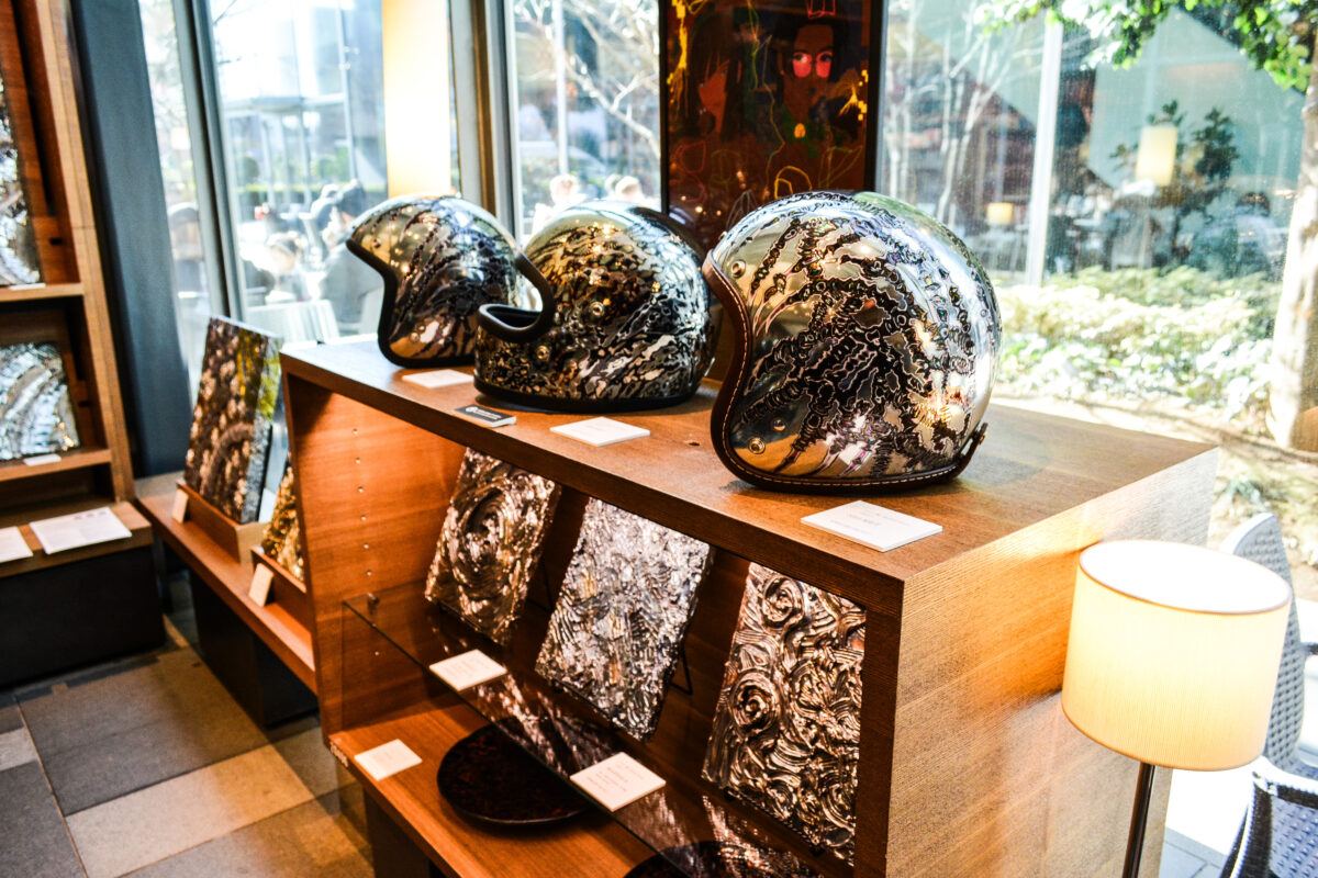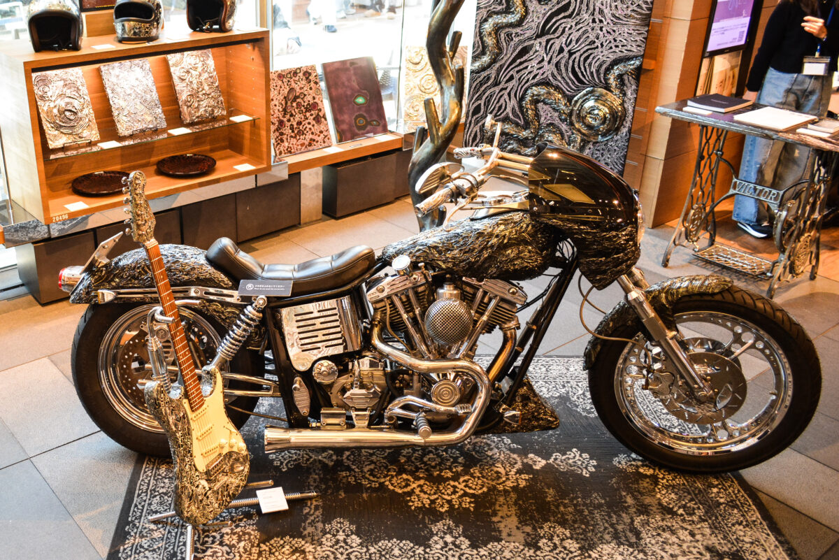 2月13日(金)からはじまった「ART SPARK 2026」は、普段から来店客が絶えない代官山・蔦屋書店2号館1階を会場とする大胆なアートイベントだ。決して広いとはいえない会場ながら、最新作を含む「DRAGON」「MANDALA」といった代表的な作品と、UNDULATIONのルーツともいえるクワイ華氏が手掛けたカスタムハーレーやヘルメット、ギター、オブジェが並べられ、そのポップアートやアブストラクトとは異なる圧倒的な熱量に引き寄せられる人々が後を絶たたなかった。