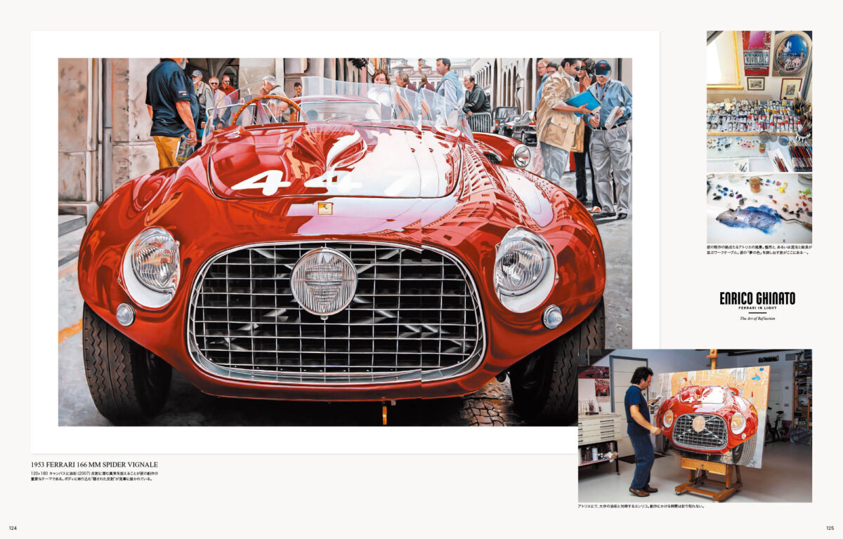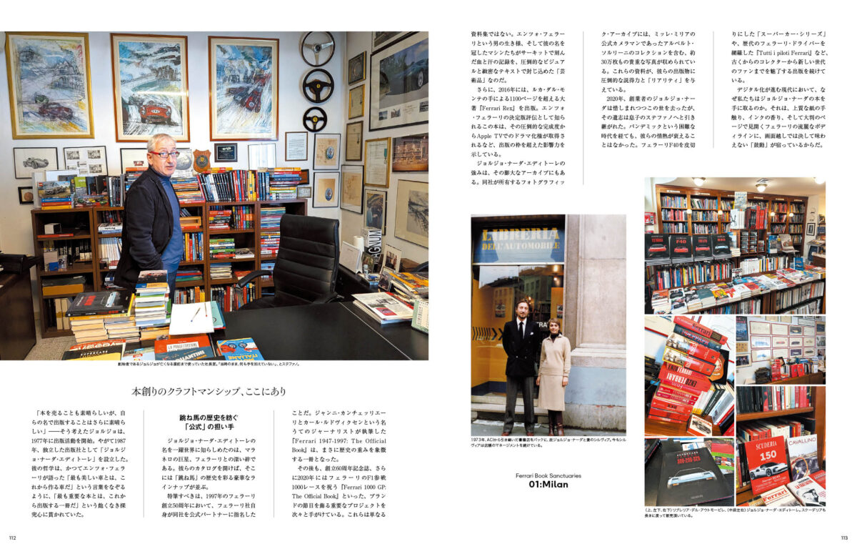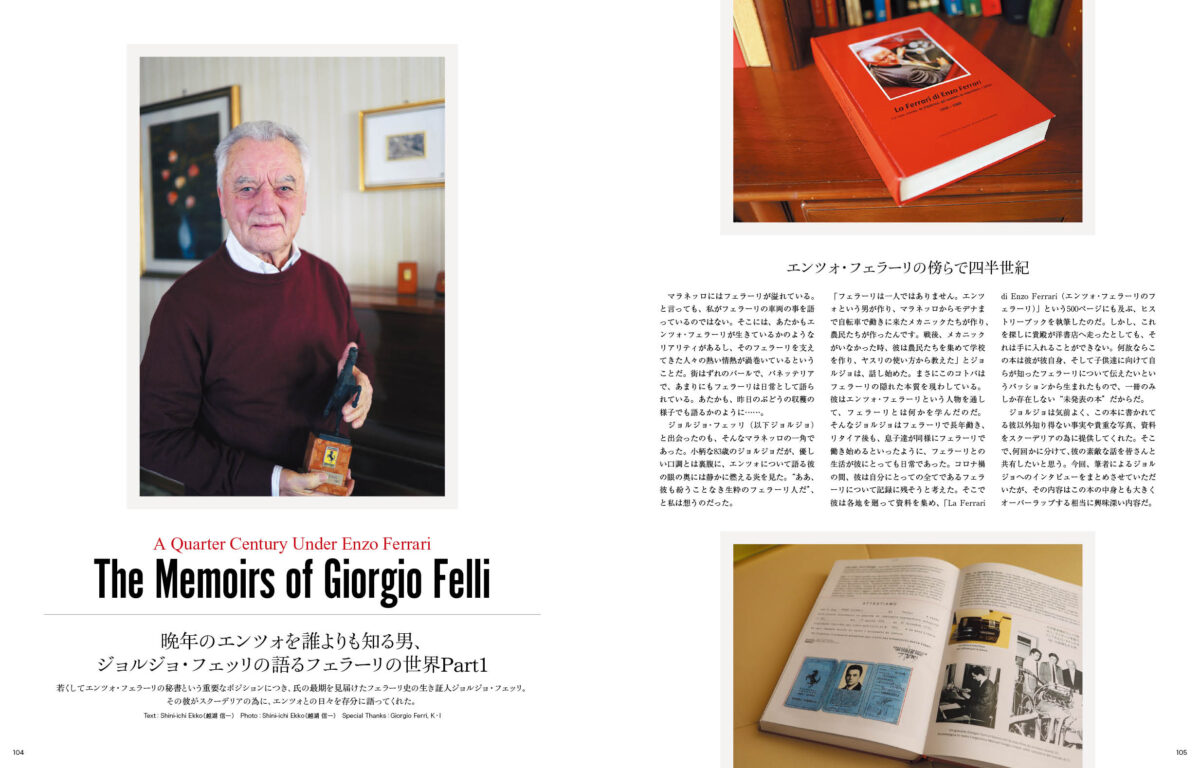 読み物としては、四半世紀、エンツォフェラーリの秘書として仕えた、ジョルジョフェッリ氏の自伝を世界初公開するとともに、フェラーリを得意とするイタリアの専門書店をミラノとモデナで一軒ずつ取材。近年クラシックカーのアート作品として注目を集めている、エンリコ・ギナート氏のフェラーリ・アート作品も厳選して掲載しております。